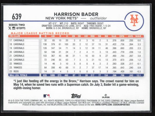2024 Topps #639 Harrison Bader Blue Holofoil Blue Prizm #/999