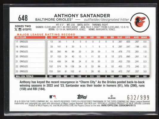 2024 Topps #648 Anthony Santander Blue Holofoil #/999