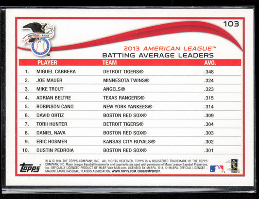 2014 Topps #103 BA Leaders (Miguel Cabrera / Joe Mauer / Mike Trout)