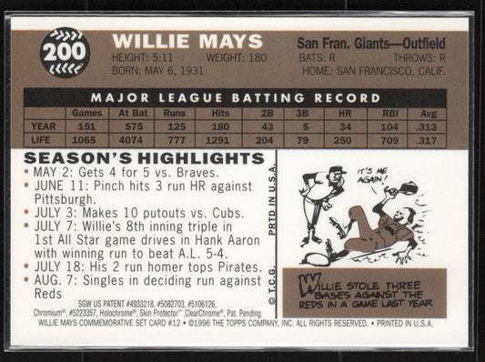 Topps Finest #12 Willie Mays Commemorative Set 1960 Reprint