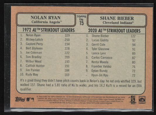 2021 Topps Heritage #TN-15 Nolan Ryan / Shane Bieber Then and Now