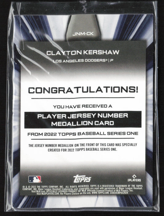 2022 Topps #JNM-CK Clayton Kershaw Player Jersey Number Medallion