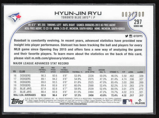 2022 Topps 1st Edition #297 Hyun-Jin Ryu Stat Card #003 of 300