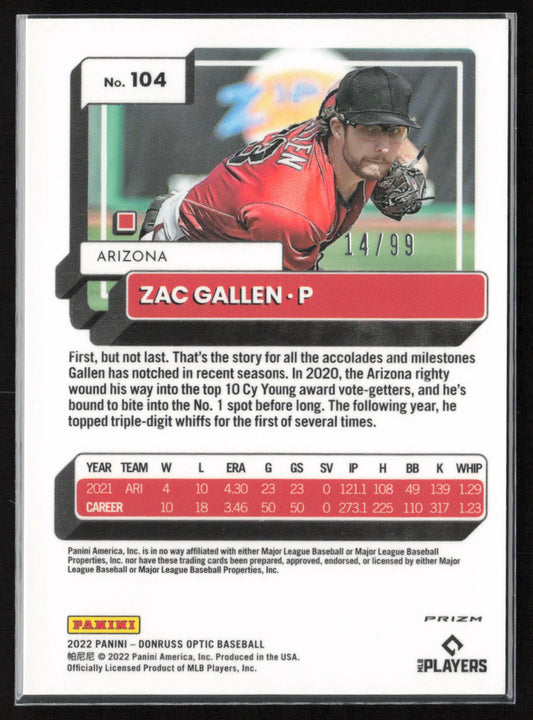 2022 Donruss Optic #104 Zac Gallen Pandora Red Prizm #14 of 99