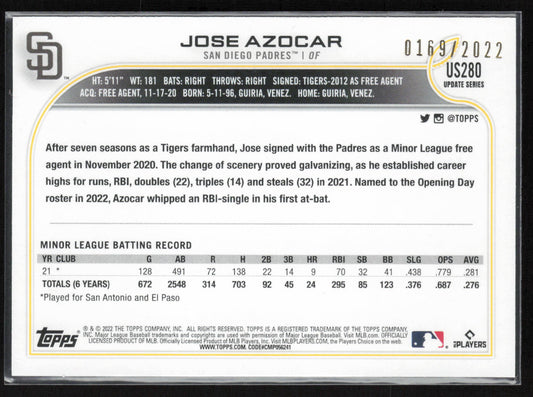 2022 Topps Update #US280 Jose Azocar Gold #0169 of 2022