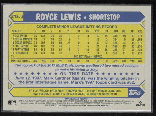 2022 Topps Update #87TBU-3 Royce Lewis 1987 Topps Baseball 35th Anniversary Blue