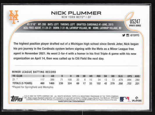 2022 Topps Update #US247 Nick Plummer Royal Blue