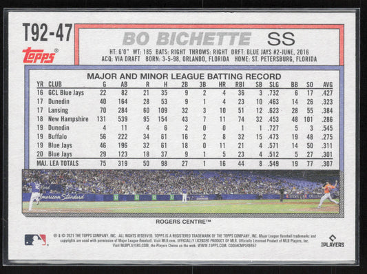 2021 Topps Update #T92-47 Bo Bichette 1992 Topps Redux