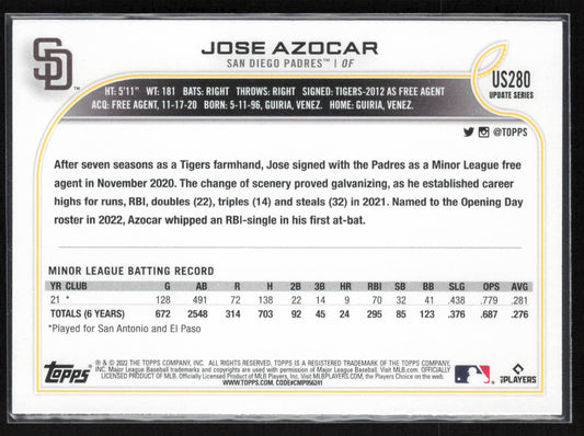 2022 Topps Update #US280 Jose Azocar Royal Blue