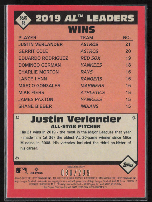 2021 Topps #86AS-18 Justin Verlander 1986 Topps 35th Anniv. All-Stars Black